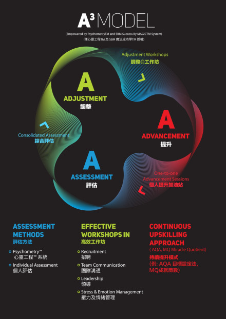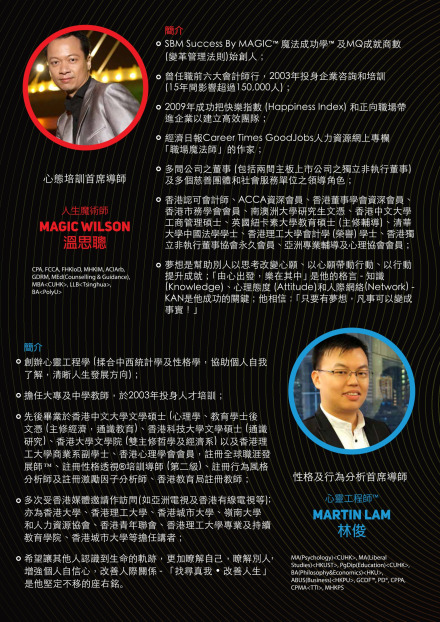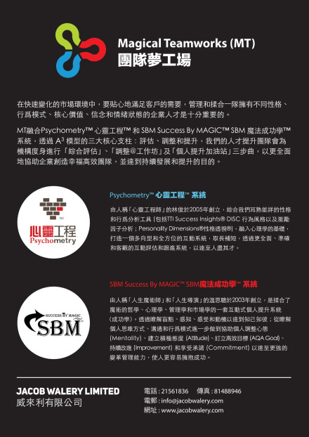 Magical Teamworks (MT) training series facilitate our working partners to understand the behaviors, personalities and core values of individuals in a team and empower them to achieve in the dynamic environment. The whole series consist of 3 major components, namely, Assessment, Adjustment and Advancement through consolidated assessment, adjustment workshops and one-to-one advancement sessions. MT training series combines the Psychometry™ 心靈工程學 and SBM Success By MAGIC™ 魔法成功學 methodologies. The training series cover the areas of team recruitment, team communication, leadership together with stress and emotion management. -- Right click the following to download leaflet!